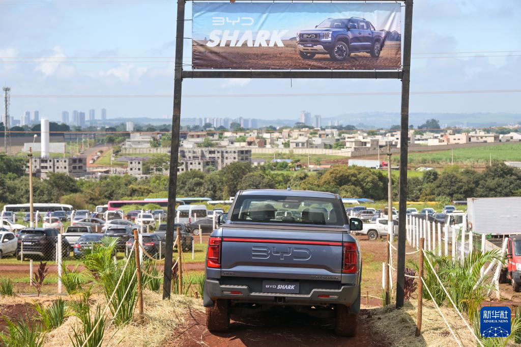 4月29日,在巴西圣保羅州里貝朗普雷圖市舉行的2025年巴西農業(yè)科技展上,一輛比亞迪皮卡進行越野演示。新華社記者 陳昊佺 攝