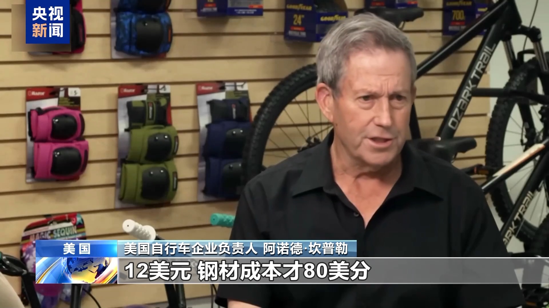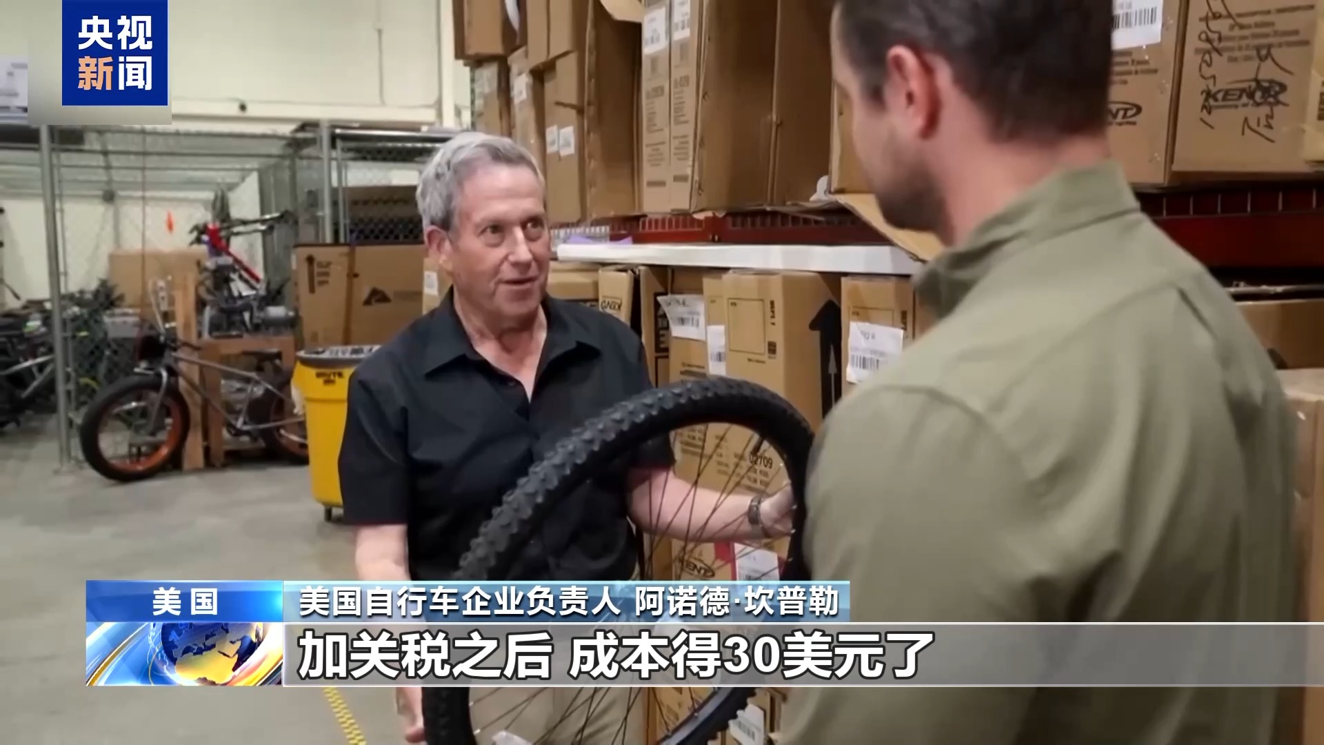 美國自行車企業(yè)負(fù)責(zé)人 阿諾德·坎普勒:像這樣一個(gè)輪子,我們?cè)瓉淼某杀敬蠹s是10到12美元,加關(guān)稅之后,成本得30美元了。