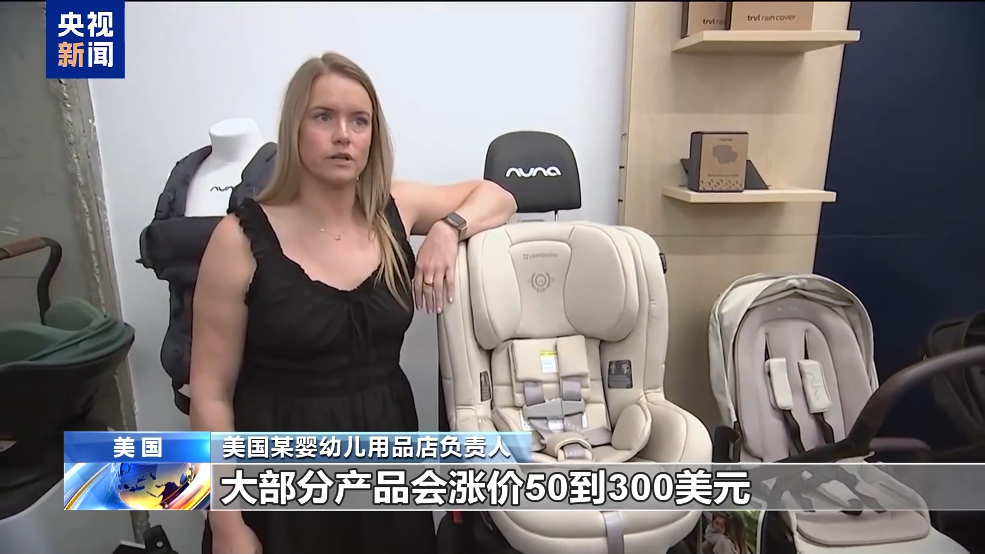 美國某嬰幼兒用品店負(fù)責(zé)人:大部分產(chǎn)品會(huì)漲價(jià)50到300美元?;径紩?huì)漲價(jià),這輛嬰兒車現(xiàn)在的售價(jià)是899.99美元,以后會(huì)漲到1200美元。店里沒有一輛嬰兒車,沒有一個(gè)汽車安全座椅,是完全使用美國制造的零部件,且在美國生產(chǎn)的純美國貨。