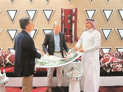 尼爾·布什(中)與Skytower Investments首席執(zhí)行官方洪(左),向沙特阿拉伯國(guó)家工業(yè)發(fā)展與物流計(jì)劃署首席執(zhí)行官蘇萊曼·本·哈立德·馬茲魯阿(右)贈(zèng)送中國(guó)絲綢畫卷。
