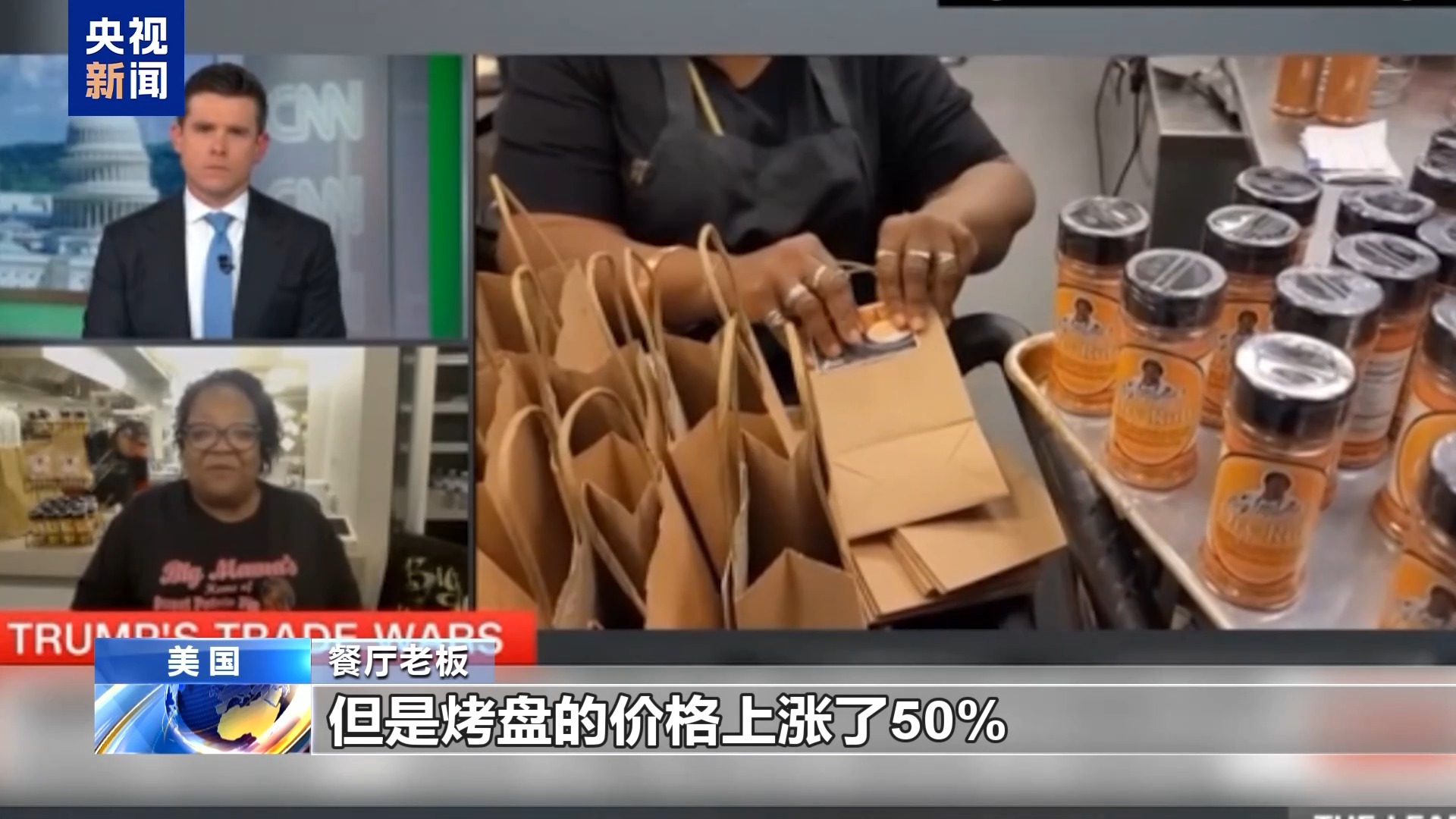 餐廳老板:我們餐廳的炸雞產品上過電視臺的節(jié)目,我們也在線上賣調料產品,這是關稅影響最大的地方。另外就是餐廳的供應,比如我們使用谷物面包,我們一般用鋁箔烤盤制作面包,但是烤盤的價格上漲了50%,所以我們現(xiàn)在換回平底鍋制作面包。
