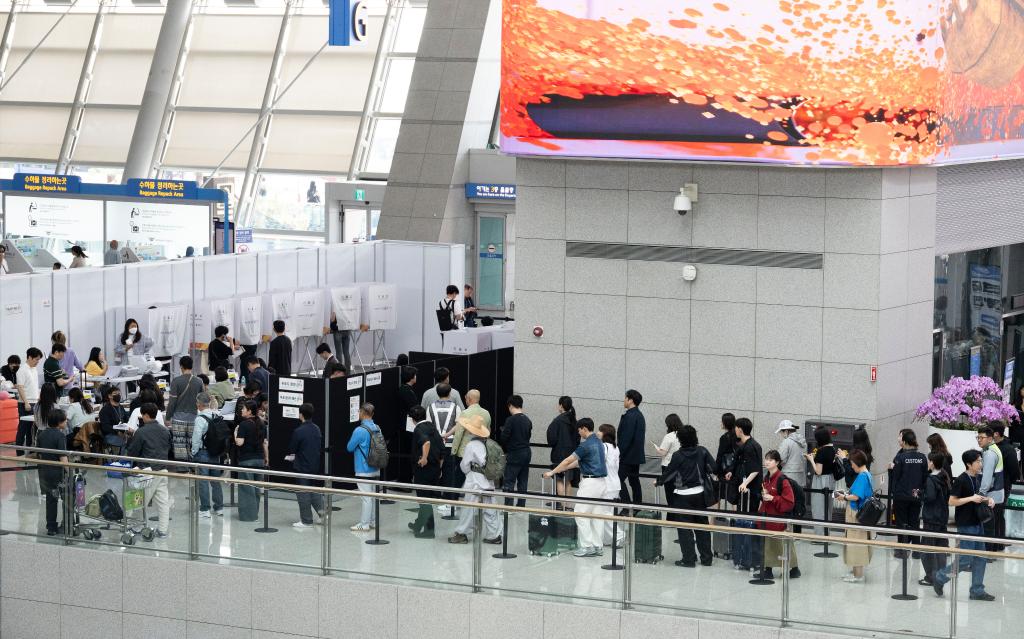 5月29日,選民在韓國(guó)仁川機(jī)場(chǎng)的投票站排隊(duì)等待投票。新華社發(fā)(全休相攝)