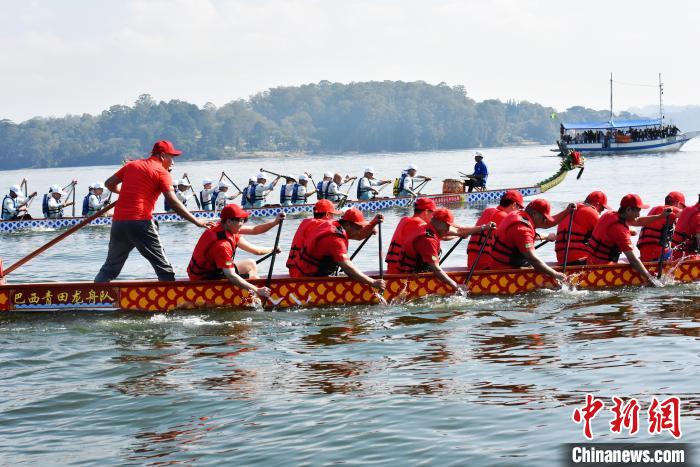 當(dāng)?shù)貢r(shí)間5月31日,巴西瑞安商會(huì)和巴西青田同鄉(xiāng)總會(huì)在巴西圣保羅聯(lián)合舉辦“慶端午,龍舟競(jìng)渡”活動(dòng),吸引近500名僑胞和巴西友人參加。圖為瑞安龍舟俱樂部的龍舟上水。中新社記者 林春茵 攝