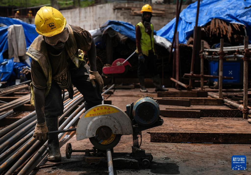 4月25日,在坦桑尼亞阿魯沙綜合體育場(chǎng)項(xiàng)目上,工人用切割機(jī)切割鋼筋。新華社記者 李亞輝 攝