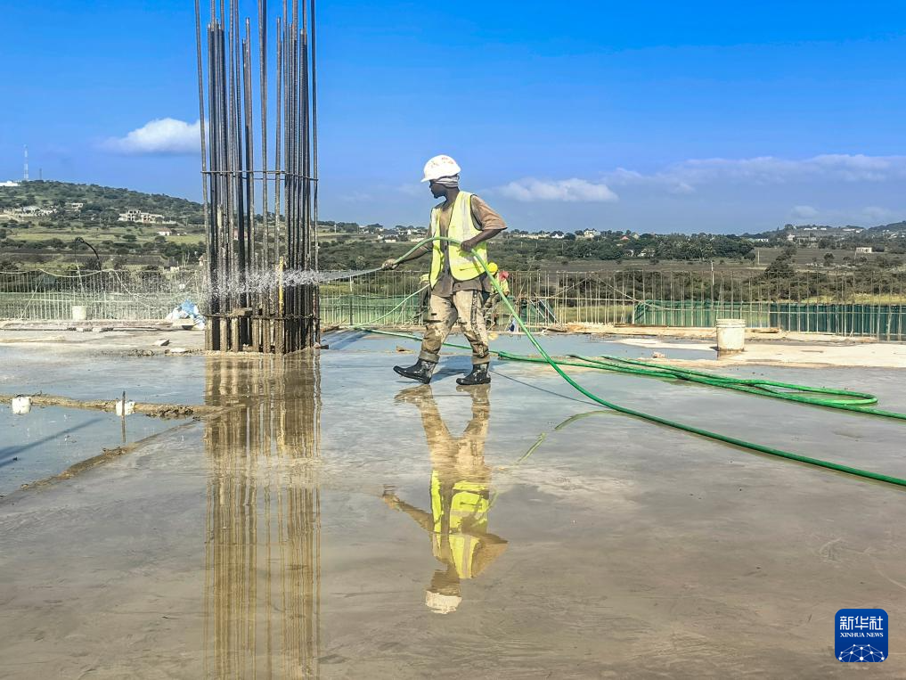 2月10日,在坦桑尼亞阿魯沙綜合體育場(chǎng)項(xiàng)目上,工人進(jìn)行混凝土養(yǎng)護(hù)作業(yè)。新華社發(fā)(中國(guó)中鐵建工集團(tuán)有限公司供圖)