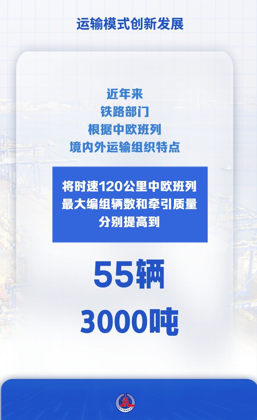 近年來(lái),鐵路部門(mén)根據(jù)中歐班列境內(nèi)外運(yùn)輸組織特點(diǎn),將時(shí)速120公里中歐班列最大編組輛數(shù)和牽引質(zhì)量分別提高到55輛、3000噸。