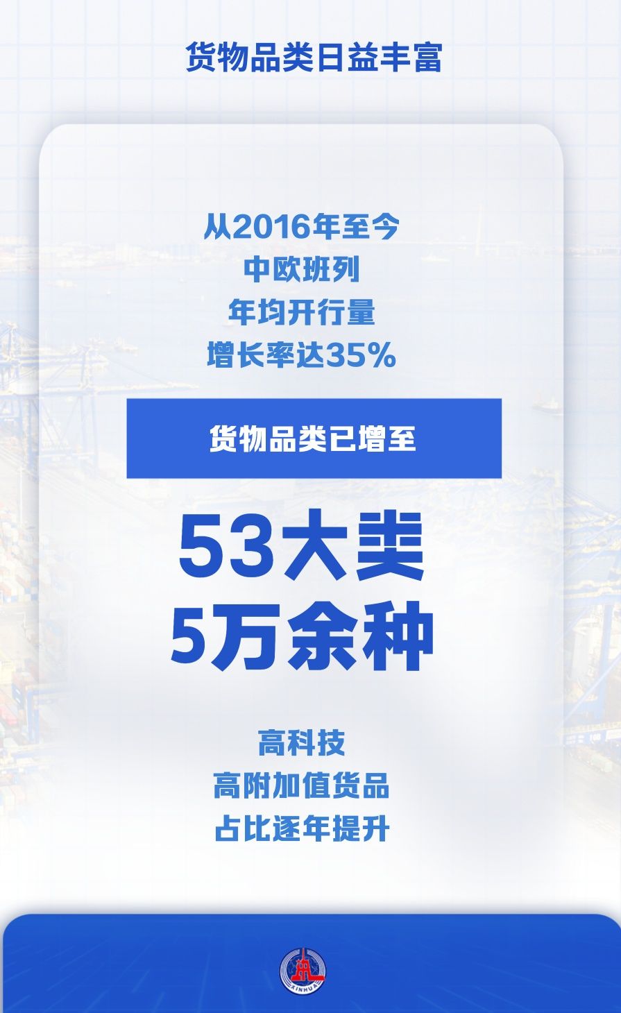 從2016年至今,中歐班列年均開(kāi)行量增長(zhǎng)率達(dá)35%,貨物品類(lèi)已增至53大類(lèi)5萬(wàn)余種,高科技、高附加值貨品占比逐年提升。