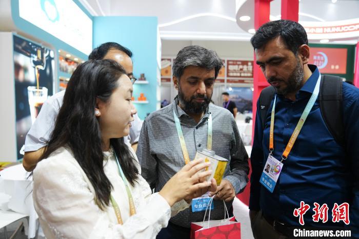 6月19日,來自巴基斯坦的客商在第9屆南博會咖啡產(chǎn)業(yè)館了解云南咖啡豆。中新社記者 劉冉陽 攝