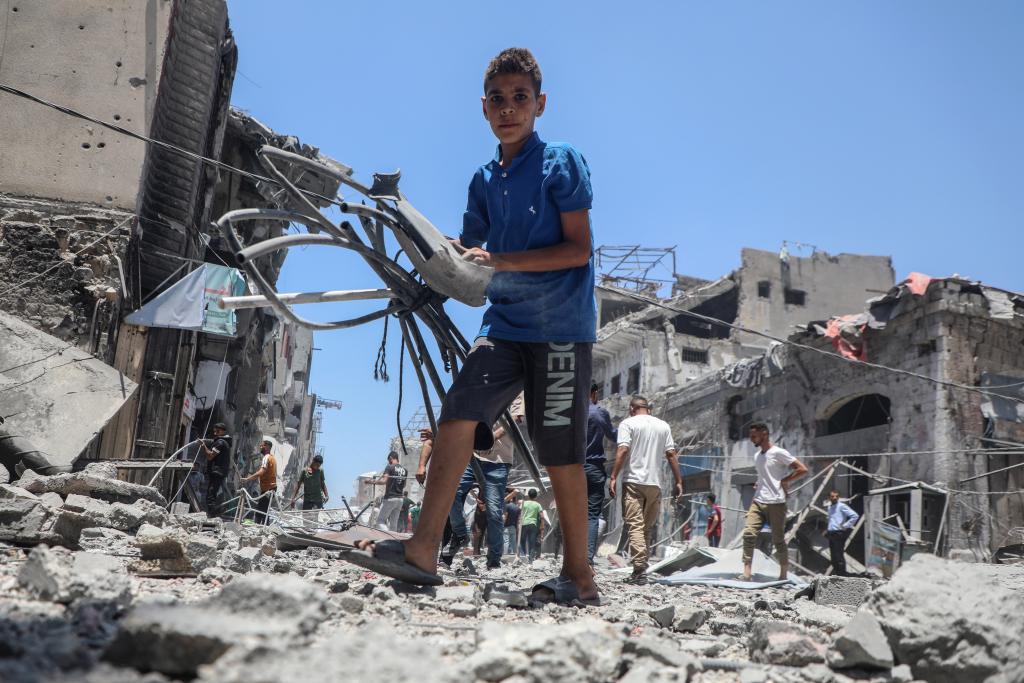 5月31日,在加沙城,一名青年在以軍襲擊后的廢墟中搜尋物品。新華社發(fā)(里澤克·阿卜杜勒賈瓦德攝)