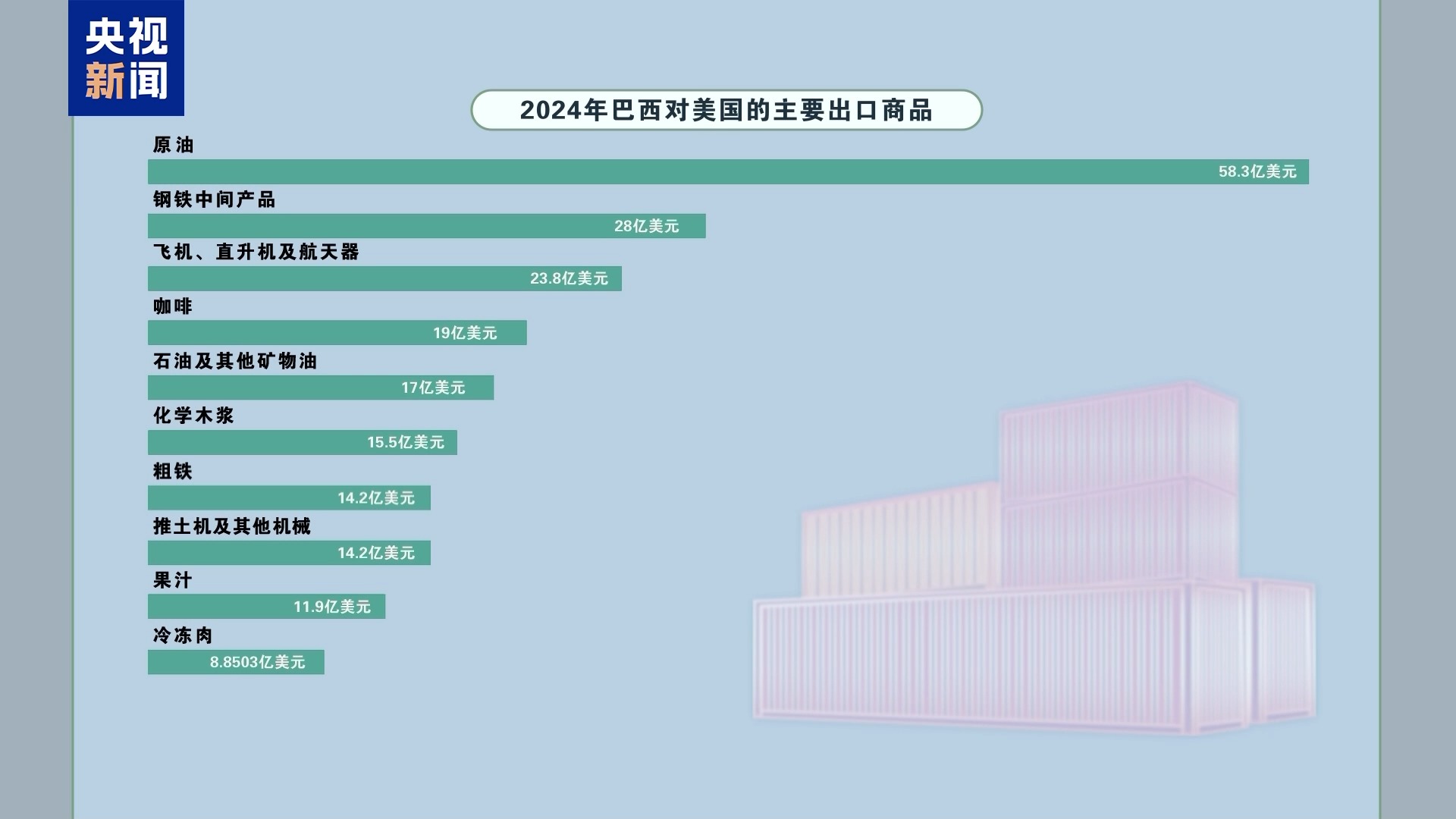 美國有線電視新聞網(wǎng)報道稱,2024年,巴西向美國出口了總額高達404億美元的商品??Х?、果汁、冷凍肉等美國民眾日常食物以及原油、粗鐵等基礎(chǔ)化工及能源商品都在排名前十內(nèi)。