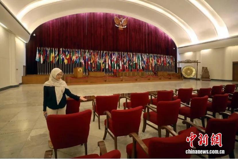 當?shù)貢r間2025年3月18日,在萬隆亞非會議紀念博物館內,工作人員展示中國代表團在1955年萬隆會議上的座席區(qū)域。 中新社記者 李志全 攝