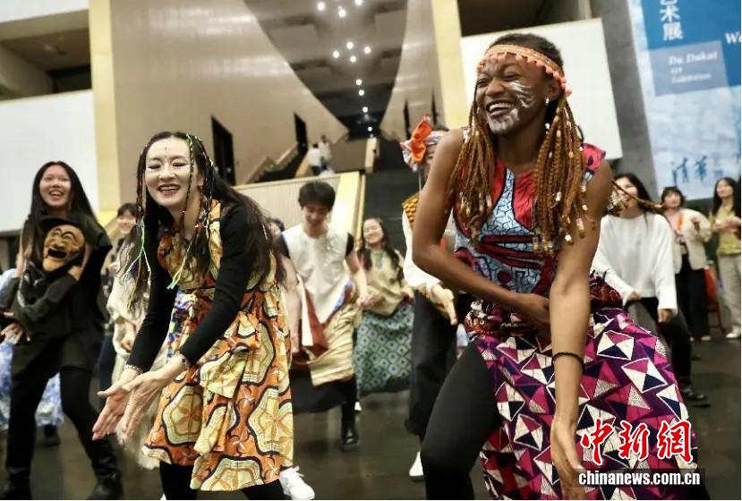 2025年4月27日,清華大學藝術博物館在北京舉辦了一場以非洲音樂舞蹈藝術為主題的公共教育活動。圖為演員和觀眾一同跳舞。 中新社記者 易海菲 攝
