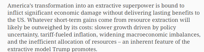文章認為,美國向資源掠奪型超級大國的蛻變,注定將無法為美國帶來持久利益,反而還會給美國自身造成重大經濟損害。資源掠奪帶來的任何短期收益,都可能被以下代價抵消:政策不確定性導致的增長放緩、關稅推高的通貨膨脹、日益擴大的宏觀經濟失衡,以及資源配置的低效——這些正是掠奪模式與生俱來的缺陷。