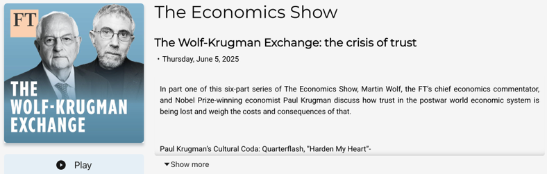 在美國關(guān)稅政策再成焦點之際,諾貝爾經(jīng)濟學(xué)獎得主保羅·克魯格曼(Paul Krugman)近日接受英國《金融時報》播客節(jié)目邀請,與《金融時報》首席經(jīng)濟評論員馬丁·沃爾夫(Martin Wolf)展開對話,制作推出六期特別節(jié)目《沃爾夫-克魯格曼對話》,討論了美國在特朗普政府政策下面臨的信任危機和治理崩潰的風(fēng)險,特別對特朗普政府的貿(mào)易與關(guān)稅政策進行了罕見的系統(tǒng)性批評。