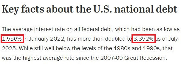 △美國皮尤研究中心的調查顯示,美聯(lián)邦債務的平均利率在美聯(lián)儲激進加息前的2022年1月曾低至1.556%,而到今年7月已翻了一倍多,達到3.352%,也是自2007-2009年大衰退以來的最高平均利率水平。