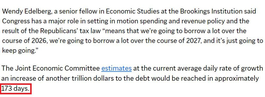 據(jù)美國國會聯(lián)合經(jīng)濟委員會估計,按照目前的日均增長速度,美債總額將在大約173天內再增加1萬億美元。