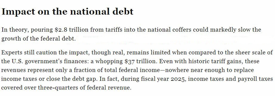雖然美國政府確實從其濫施的關稅中“賺”了一筆,但專家們仍然警告指出,與37萬億美元的龐大美債規(guī)模相比,關稅收入實屬九牛一毛。即使加上歷史上的關稅收益,它們也只占聯(lián)邦總收入的一小部分,遠不足以取代所得稅或縮小債務缺口。