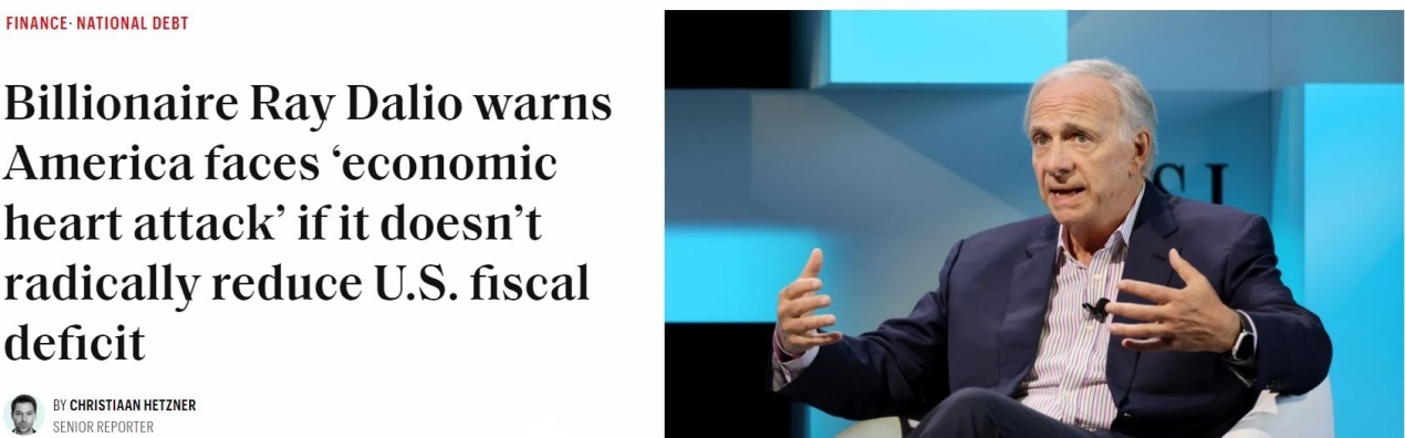 美國橋水基金創(chuàng)始人達利歐此前更是警告,如果不能有效控制財政赤字和債務規(guī)模,美國經(jīng)濟遲早會“心臟病發(fā)作”。