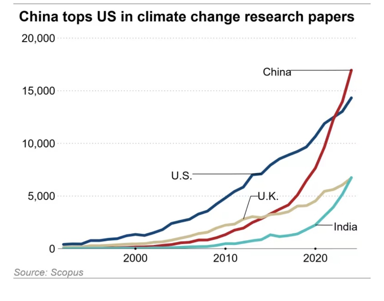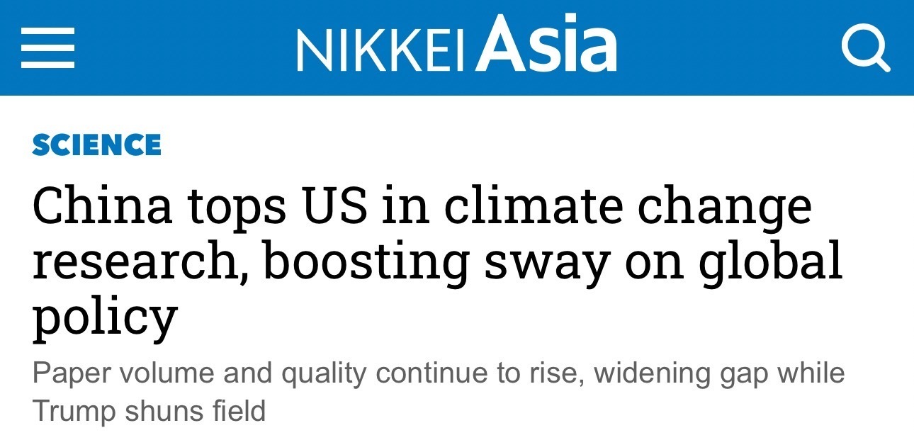 《日經亞洲評論》22日發(fā)布的一篇文章指出,中國在2023年發(fā)表的氣候變化研究論文數量超過了美國,并在次年擴大了領先優(yōu)勢。這一趨勢凸顯了中國全球影響力的持續(xù)增長,與此同時,美國卻在逐漸退出這一領域。