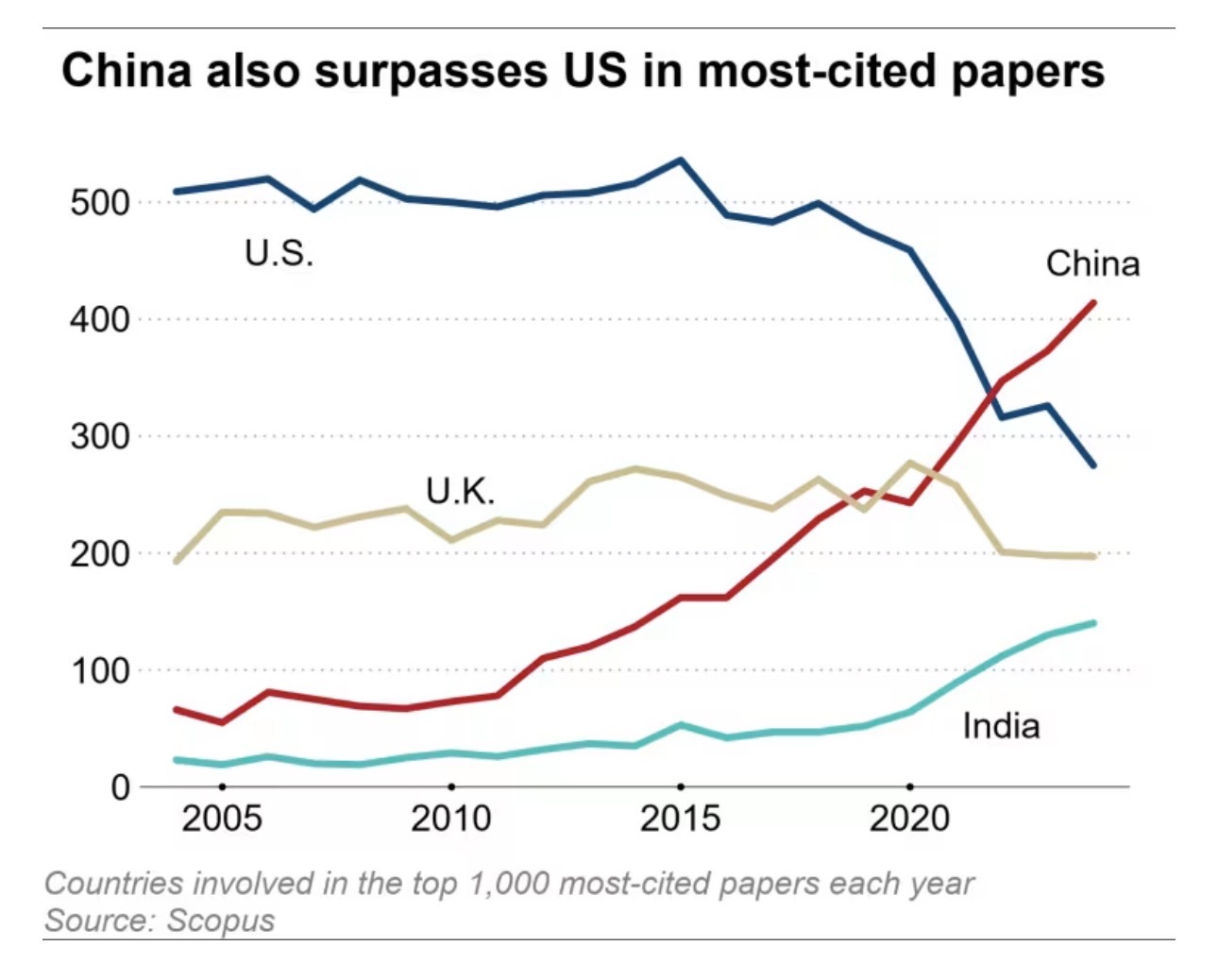 文章表示,中國氣候變化研究論文在其他文獻中的引用次數也在顯著增加——這是研究質量的一個重要標志。從2004年到2024年,每年被引用次數最多的1000篇論文中,中國在2022年超越美國,占據了領先地位。