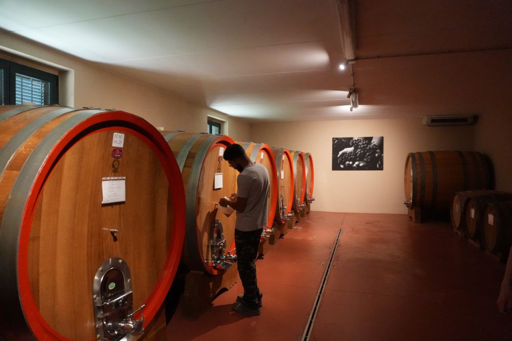 8月17日,在意大利拉莫拉鎮(zhèn),馬斯卡雷洛家族酒莊負責人法比奧·馬斯卡雷洛在酒窖里工作。新華社記者張馨文攝