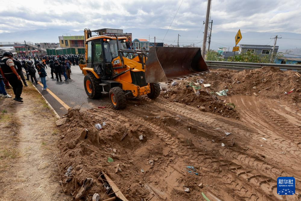 9月16日,在厄瓜多爾首都基多,一輛推土機在清理示威者設置的路障。新華社發(fā)(里卡多·蘭德塔攝)