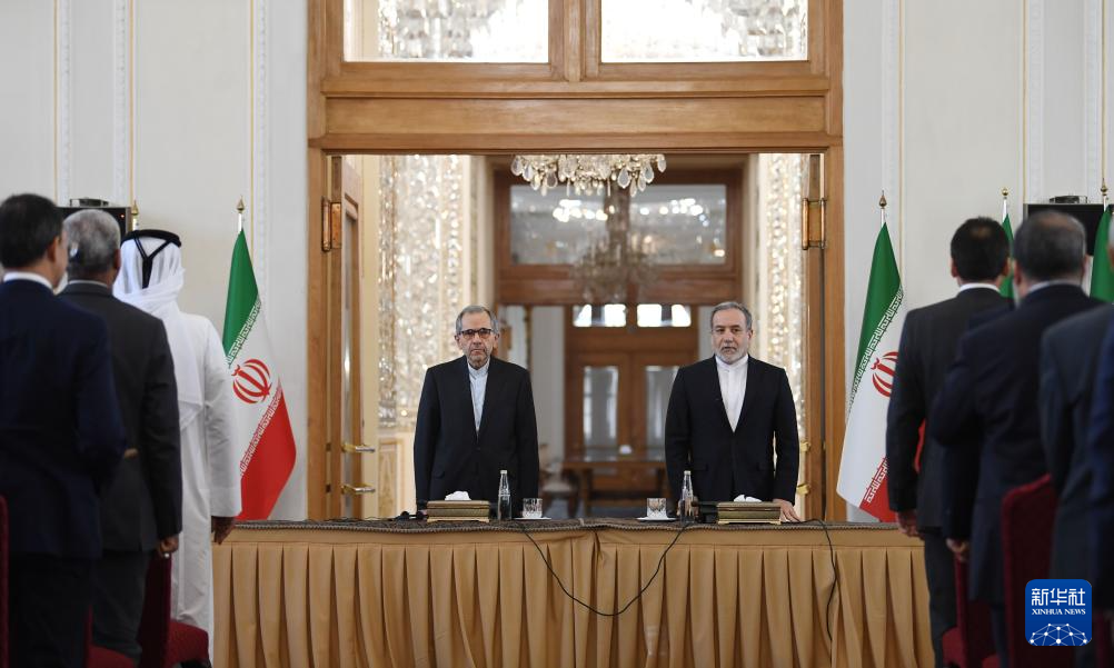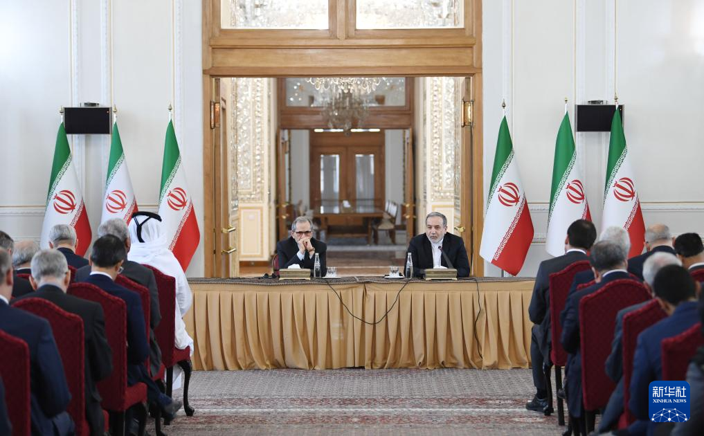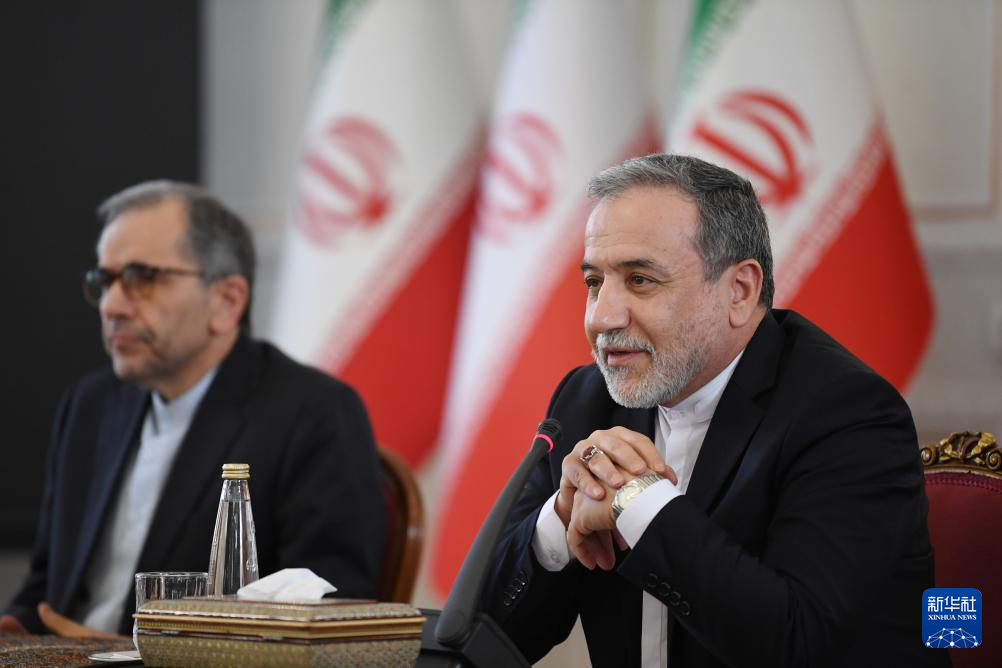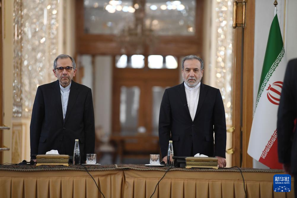 10月5日,在伊朗首都德黑蘭,伊朗外交部長阿拉格齊(右)出席與多國駐伊朗外交人員舉行的會(huì)議。新華社記者 沙達(dá)提 攝