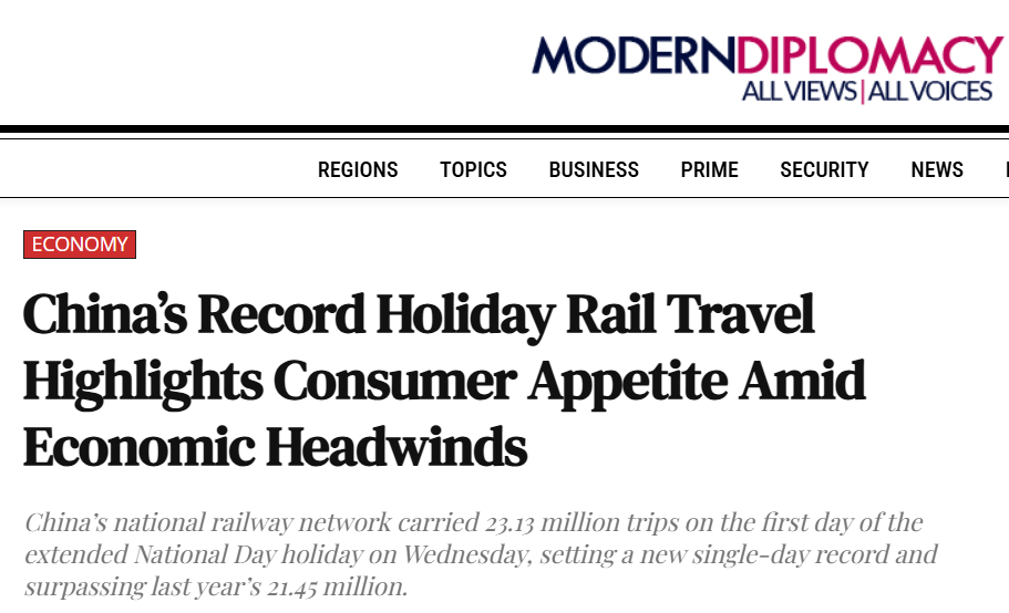 歐洲《現(xiàn)代外交》(Modern Diplomacy)網(wǎng)站報(bào)道注意到,中國(guó)國(guó)慶中秋“超長(zhǎng)黃金周”首日,全國(guó)鐵路發(fā)送旅客2313萬人次,創(chuàng)下單日歷史新高。報(bào)道援引官方預(yù)測(cè)稱,整個(gè)八天假期出行總量預(yù)計(jì)將達(dá)23.6億人次,日均出行近3億人,堪稱“史上最忙假期”。