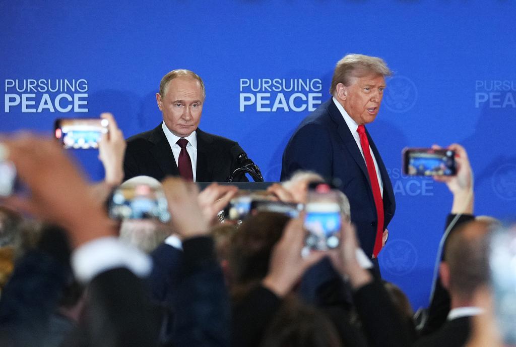 8月15日,美國(guó)總統(tǒng)特朗普(后右)與俄羅斯總統(tǒng)普京(后左)在美國(guó)阿拉斯加州安克雷奇市埃爾門(mén)多夫-理查森聯(lián)合軍事基地舉行會(huì)晤后共同出席聯(lián)合記者會(huì)。新華社記者吳曉凌攝