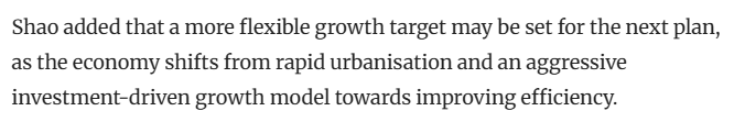 《南華早報(bào)》援引分析人士的表述認(rèn)為,隨著中國(guó)經(jīng)濟(jì)從快速城鎮(zhèn)化和投資驅(qū)動(dòng)型增長(zhǎng)模式轉(zhuǎn)向高質(zhì)量發(fā)展,中國(guó)下一個(gè)五年規(guī)劃可能會(huì)設(shè)定更靈活的增長(zhǎng)目標(biāo)。