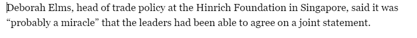 半島電視臺(tái)也關(guān)注了此次峰會(huì),報(bào)道援引新加坡欣里奇基金會(huì)貿(mào)易政策負(fù)責(zé)人黛博拉 埃爾姆斯的話說(shuō),各成員領(lǐng)導(dǎo)人能夠就聯(lián)合聲明達(dá)成一致是“了不起的事情”。他說(shuō),鑒于亞太經(jīng)合組織經(jīng)濟(jì)體的不同立場(chǎng),要將任何達(dá)成一致的措辭寫入文件都是一項(xiàng)“充滿挑戰(zhàn)的工作”。