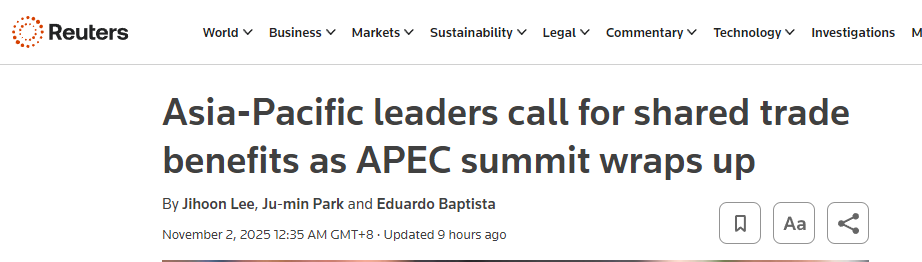 2025年亞太經(jīng)合組織(APEC)領(lǐng)導(dǎo)人非正式會(huì)議于10月31日至11月1日在韓國(guó)慶州舉行,會(huì)議發(fā)表了《慶州宣言》。多家外媒報(bào)道稱,會(huì)議凸顯了亞太地區(qū)經(jīng)濟(jì)體對(duì)自由貿(mào)易的承諾。