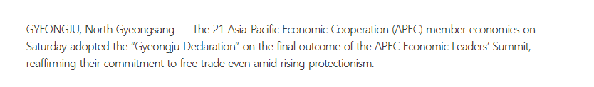 韓國(guó)《中央日?qǐng)?bào)》報(bào)道稱,《慶州宣言》反映出此次APEC領(lǐng)導(dǎo)人峰會(huì)的最終成果,并重申了在保護(hù)主義抬頭 的背景下,各成員領(lǐng)導(dǎo)人對(duì)自由貿(mào)易的承諾。
