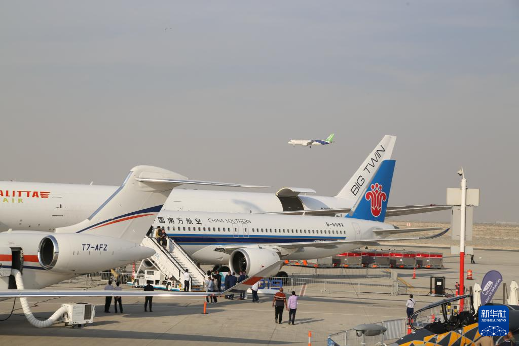11月17日,在阿聯(lián)酋迪拜,中國商飛的C919飛機(jī)進(jìn)行飛行展示,地面上停著的是中國南航的C919飛機(jī)。新華社記者 溫新年 攝