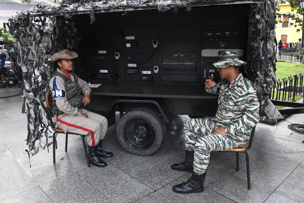 10月4日,在委內(nèi)瑞拉首都加拉加斯的玻利瓦爾廣場(chǎng),玻利瓦爾民兵組織成員操作通信設(shè)備。新華社發(fā)(馬科斯·薩爾加多攝)