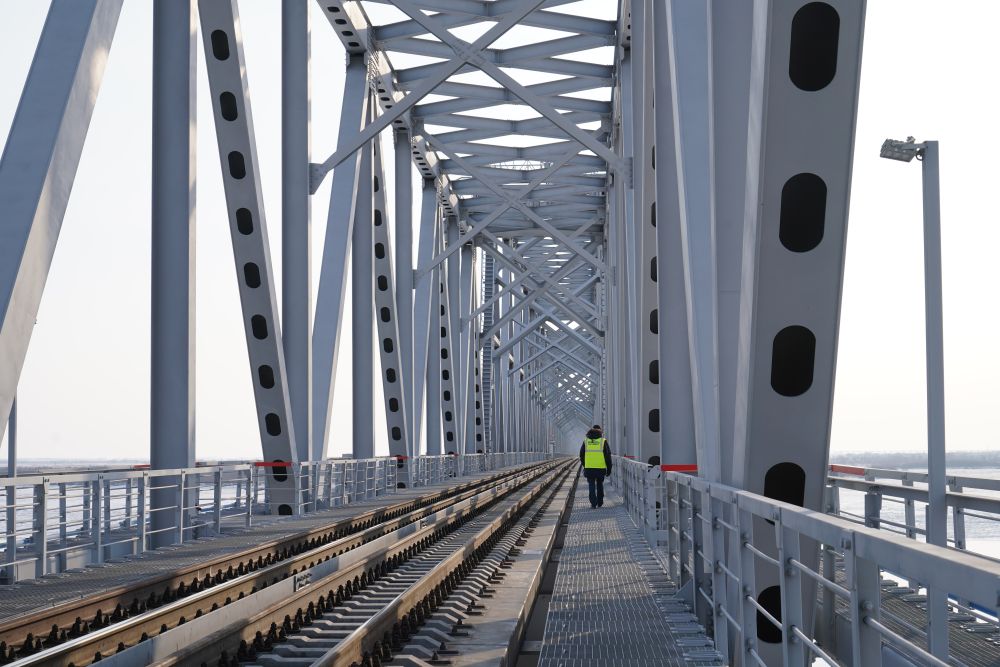 12月6日,在俄羅斯猶太自治州下列寧斯闊耶,俄方人員在跨越阿穆?tīng)柡樱ê邶埥┑耐铝袑幩归熞F路大橋上巡視。新華社記者 劉愷 攝
