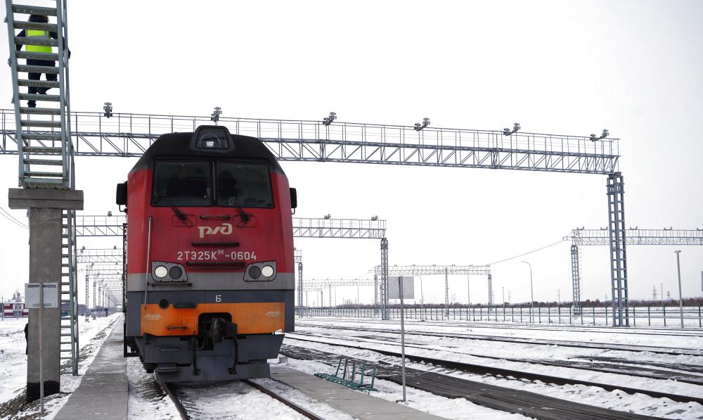 12月6日,一輛即將開(kāi)往中國(guó)的俄羅斯貨運(yùn)列車(chē)??吭诙砹_斯下列寧斯闊耶鐵路口岸。新華社記者 劉愷 攝