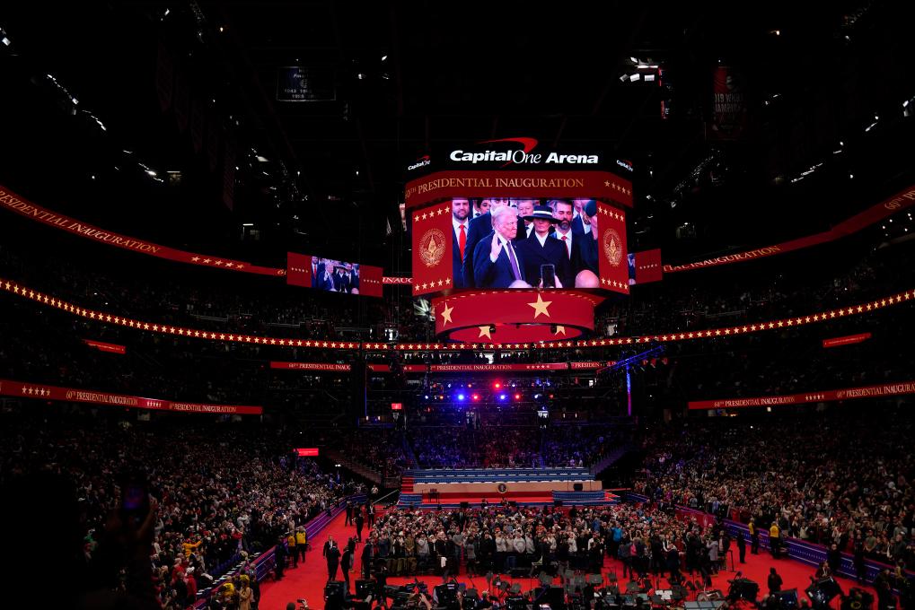 1月20日,在美國首都華盛頓第一資本體育館,人們觀看美國第47任總統(tǒng)就職典禮的轉播。新華社記者吳曉凌攝