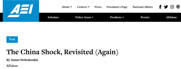 當(dāng)前全球經(jīng)濟(jì)復(fù)蘇乏力、貿(mào)易保護(hù)主義抬頭,部分西方政客與媒體頻繁炒作“中國沖擊論”,企圖將損人不利己的“關(guān)稅大棒”合理化。美國知名保守派智庫美國企業(yè)公共政策研究所(American Enterprise Institute for Public Policy Research)高級(jí)研究員詹姆斯·佩索科基斯(James Pethokoukis)近日發(fā)文稱,基于大量數(shù)據(jù)分析與案例研究,“中國沖擊論”站不住腳,中國融入全球經(jīng)濟(jì)促進(jìn)了美國經(jīng)濟(jì)增長(zhǎng),實(shí)際上顯著提高了美國人民的生活品質(zhì)。