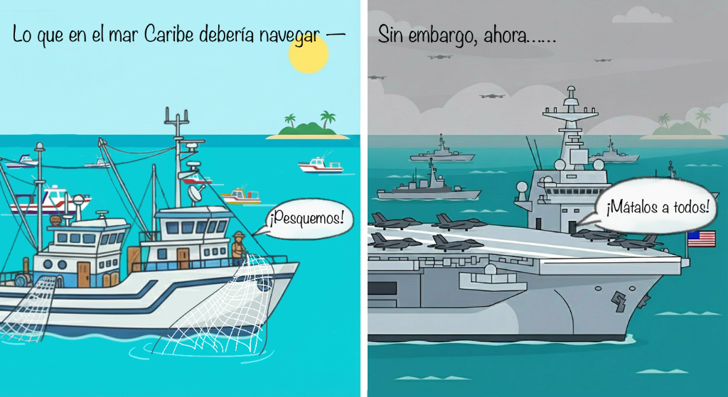 漫畫(huà)《“加勒比海盜”》。畫(huà)面左側(cè),航行在加勒比海上的本該是收獲滿滿的漁船。但在畫(huà)面右側(cè),現(xiàn)如今的加勒比海陰云密布、軍艦成群,回蕩著美軍“不留活口”的口號(hào)。