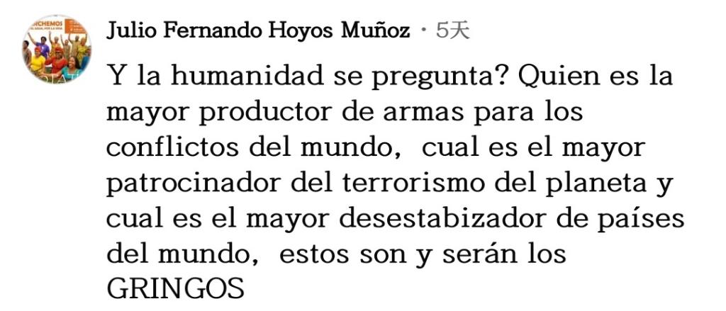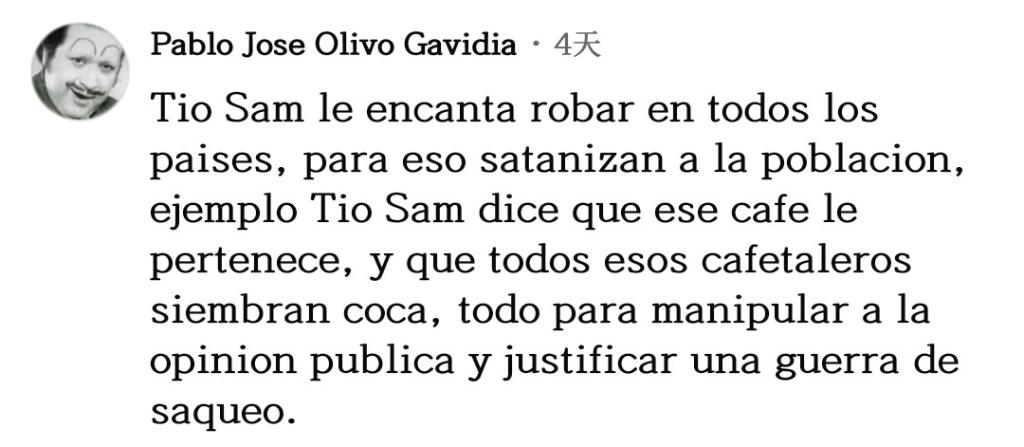 網(wǎng)友巴勃羅·奧利沃留言說(shuō):“山姆大叔喜歡在所有國(guó)家盜竊,為此他們妖魔化民眾,譬如山姆大叔說(shuō)那片咖啡園是屬于他的,還說(shuō)所有那些咖啡農(nóng)在種植古柯,所有這一切都是為了操弄輿論,為了給他們的掠奪戰(zhàn)爭(zhēng)辯護(hù)。”