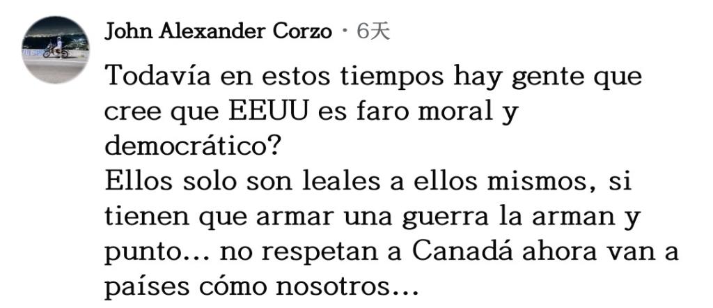 網(wǎng)友約翰·科爾索坦言道:“時(shí)至今日,還有人相信美國(guó)是道德和民主的燈塔嗎?他們只忠于自己,如果需要發(fā)動(dòng)一場(chǎng)戰(zhàn)爭(zhēng),他們隨時(shí)會(huì)發(fā)動(dòng),僅此而已!他們連加拿大都不尊重,現(xiàn)在矛頭對(duì)準(zhǔn)我們這樣的國(guó)家了?!?/p>