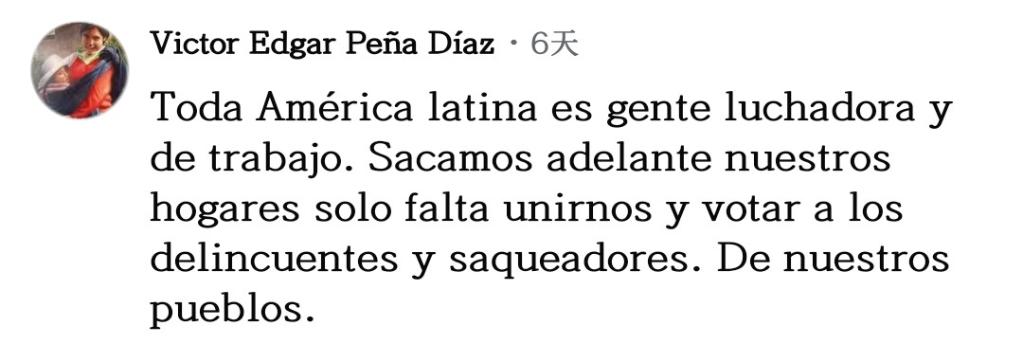 網(wǎng)友維克托·培尼亞留言說(shuō):“所有拉美人民都是勞動(dòng)者和奮斗者,我們靠自己的努力養(yǎng)家糊口?,F(xiàn)在只差團(tuán)結(jié)起來(lái),把那些掠奪我們的罪犯和強(qiáng)盜趕跑?!?/p>