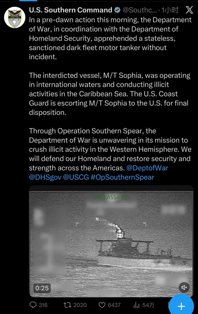 此外,美國南方司令部7日在社交媒體發(fā)布消息稱,美國當(dāng)天凌晨攔截“一艘無國籍、受制裁的‘影子艦隊(duì)’油輪”,行動(dòng)過程中未發(fā)生任何意外。該船名為“索菲亞”號,當(dāng)時(shí)正在國際水域航行。美國海岸警衛(wèi)隊(duì)正在控制“索菲亞”號前往美國進(jìn)行處置。據(jù)路透社消息,這艘船1月早些時(shí)候從委內(nèi)瑞拉駛離。(記者:馬驍、湯潔峰)