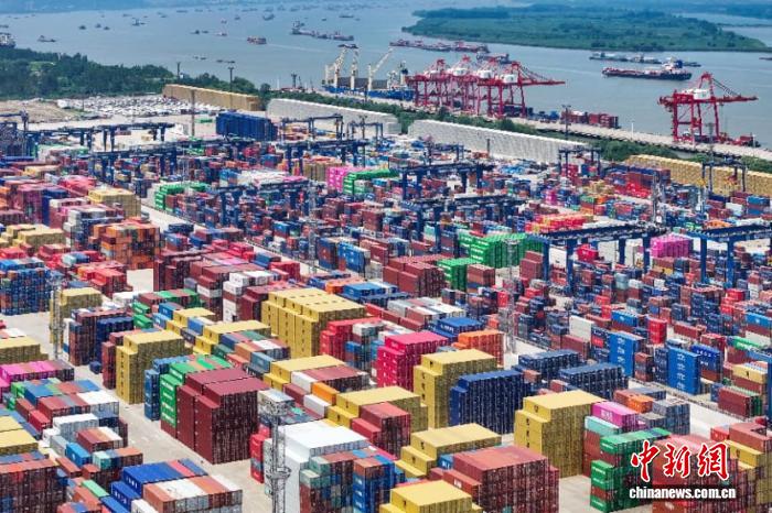 2025年7月14日,航拍長(zhǎng)江沿線南京龍?zhí)陡圻M(jìn)出口集裝箱碼頭。(資料圖) 中新社記者 泱波 攝