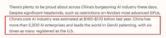 《時(shí)代》周刊的文章以中國人工智能實(shí)體企業(yè)從業(yè)人員的經(jīng)歷為切入口,稱自豪感正蔓延至中國蓬勃發(fā)展的AI產(chǎn)業(yè)。2025年中國核心AI產(chǎn)業(yè)規(guī)模達(dá)1600-1700億美元。數(shù)據(jù)顯示,中國擁有5300余家AI企業(yè),其生成式AI專利數(shù)量是美國的6倍。