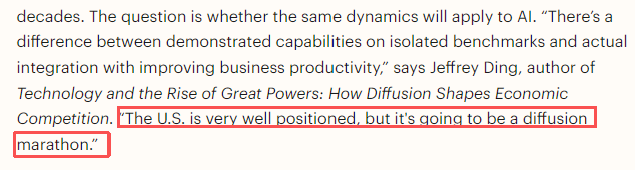 正如科技史著作《科技與大國崛起》的作者杰弗里·丁所言:“基準(zhǔn)測試表現(xiàn)與實(shí)際生產(chǎn)力提升是兩回事。盡管美國現(xiàn)在的位置不錯(cuò),但是這是一場持久的馬拉松?!?/p>