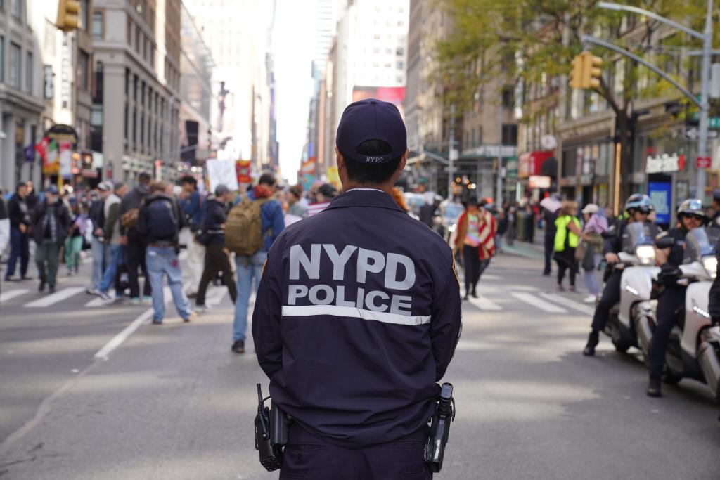 2025年10月18日,在美國(guó)紐約,警察在示威游行活動(dòng)現(xiàn)場(chǎng)執(zhí)勤。新華社記者張鳳國(guó)攝