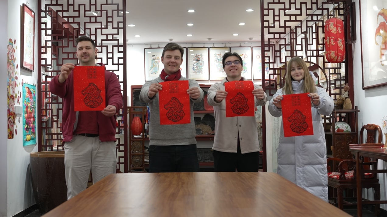 帝漢尼:我?guī)麄兏惺苤袊鴤鹘y(tǒng)文化,有剪紙,我們一起剪了一個“春”字。我還帶他們?nèi)ネ啬戤?,先刷上墨,再把紙放上面,用木板刷刷刷,他們覺得很有意思。我們印了一個馬。我們還一起包餃子,我像個老師一樣教他們包餃子。其實我包得不好看,他們包得也不好看,主要是我們包餃子這個過程特別開心。