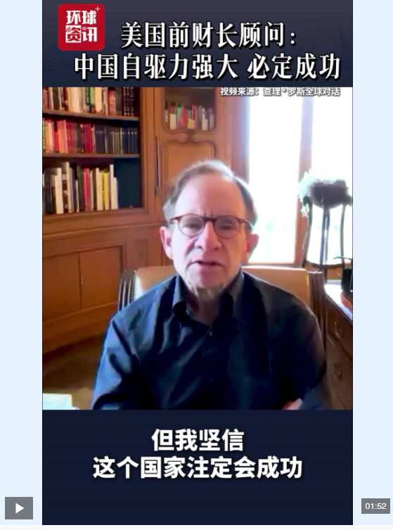 近日,美國(guó)前財(cái)政部長(zhǎng)顧問(wèn)史蒂文·拉特納在接受美國(guó)播客節(jié)目《查理·羅斯全球?qū)υ挕窌r(shí)表示,近20年來(lái)中國(guó)經(jīng)濟(jì)的高速發(fā)展不僅源于經(jīng)濟(jì)因素,更得益于中國(guó)人民追求成功的強(qiáng)大自驅(qū)力。他指出,這種難以用經(jīng)濟(jì)模型量化的拼搏精神深刻塑造了國(guó)家的經(jīng)濟(jì)前景,并認(rèn)為中國(guó)必定會(huì)成功。